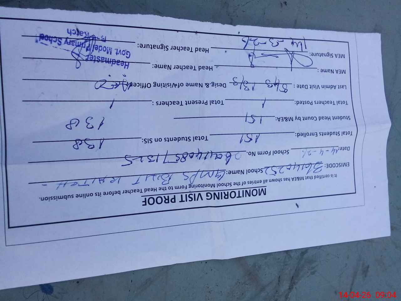 | Attendance Register | Head Teacher | MEA with School | Visit Proof |