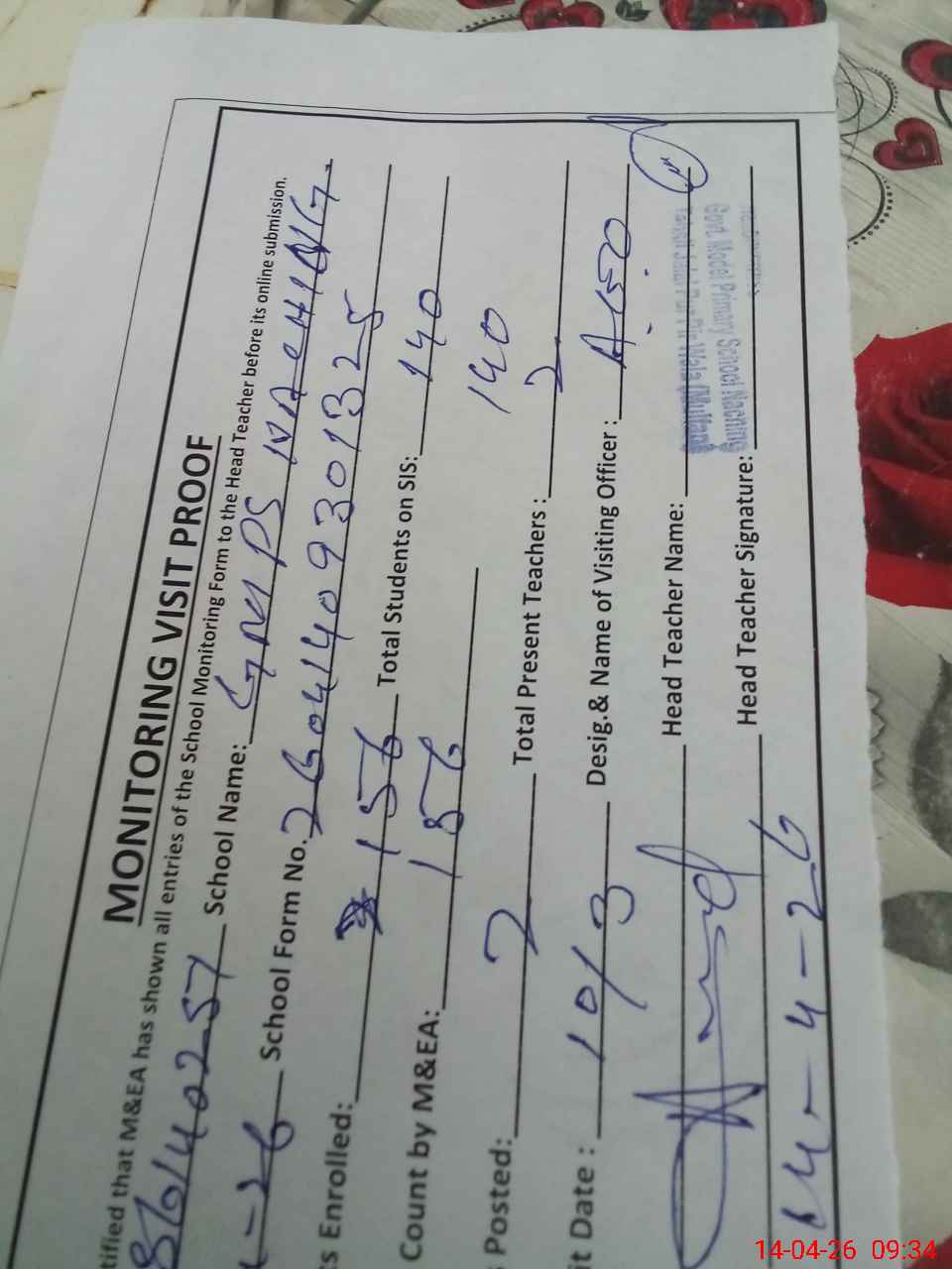 | Attendance Register | Head Teacher | MEA with School | Visit Proof |