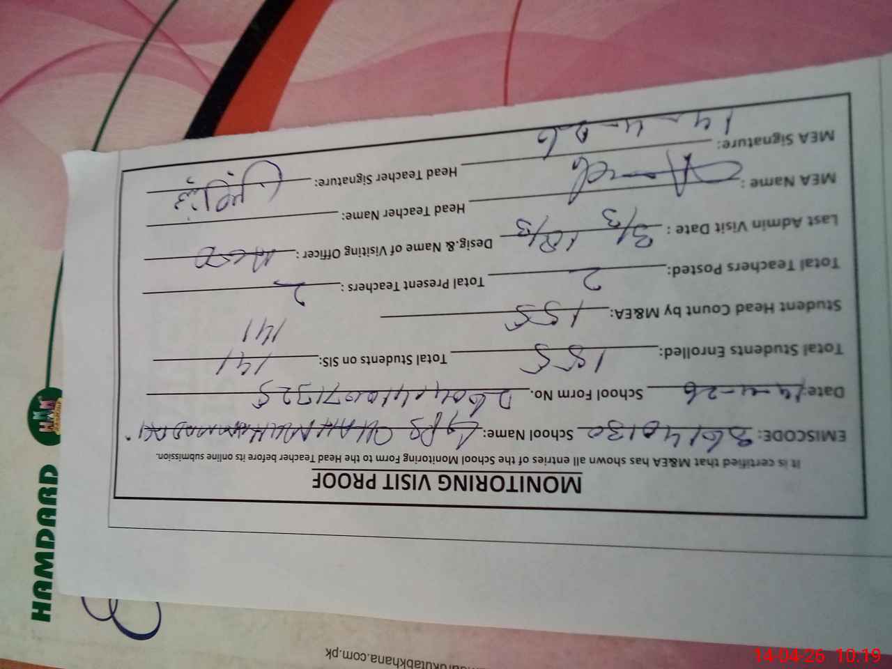 | Certified that this School was Inspected by the Undersigned MEA/DMO Today and the Information Stated Above is as Per Record. | |||||