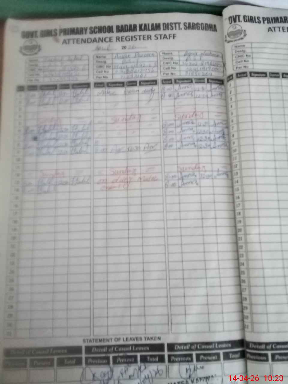 | CNIC | Full Name | Designation | R/C | Absence During Last Calender Month |