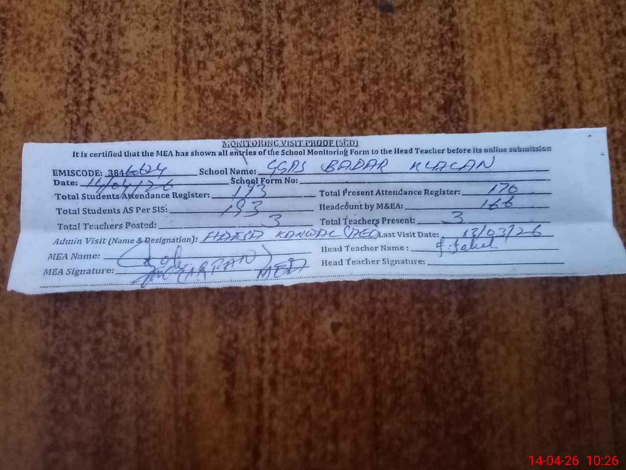 | Attendance Register | Head Teacher | MEA with School | Visit Proof |