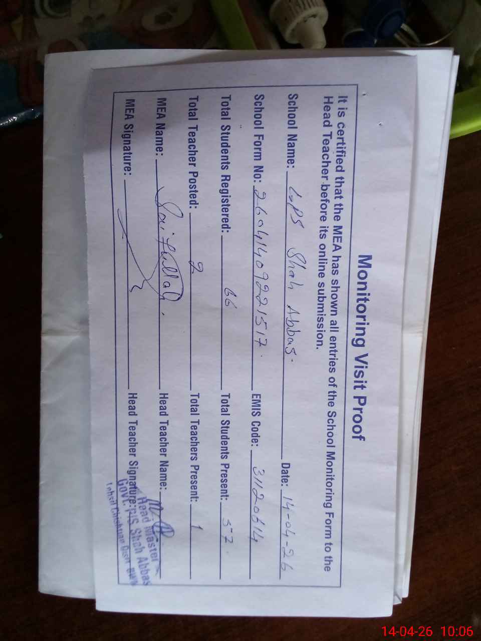 | EMIS Code: 31120614 | Name of School: GPS SHAH ABBAS | |||