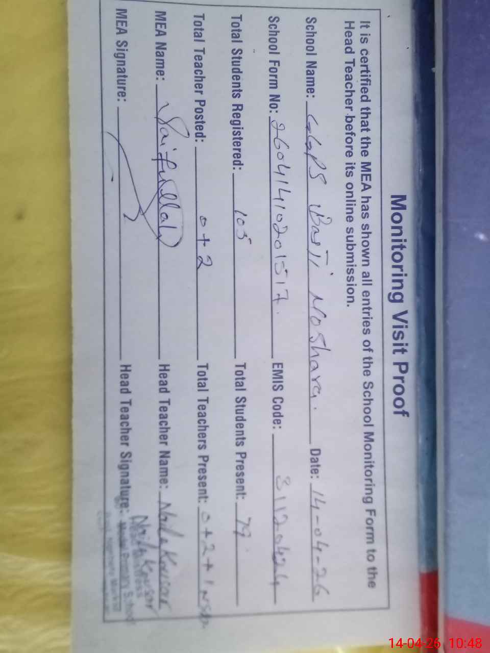 | Attendance Register | Head Teacher | MEA with School | Visit Proof |