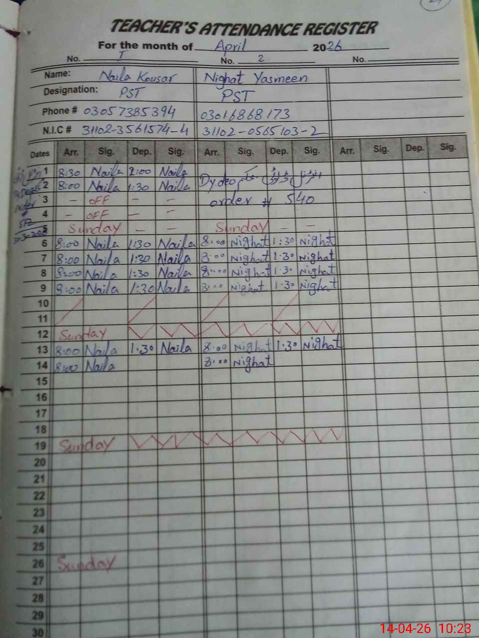 | CNIC | Full Name | Designation | R/C | Absence During Last Calender Month |
