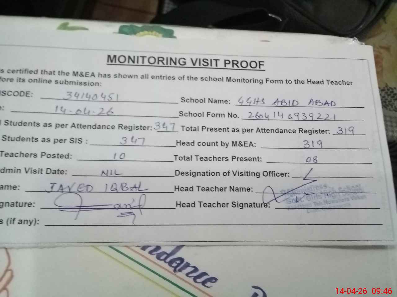 | Attendance Register | Head Teacher | MEA with School | Visit Proof |