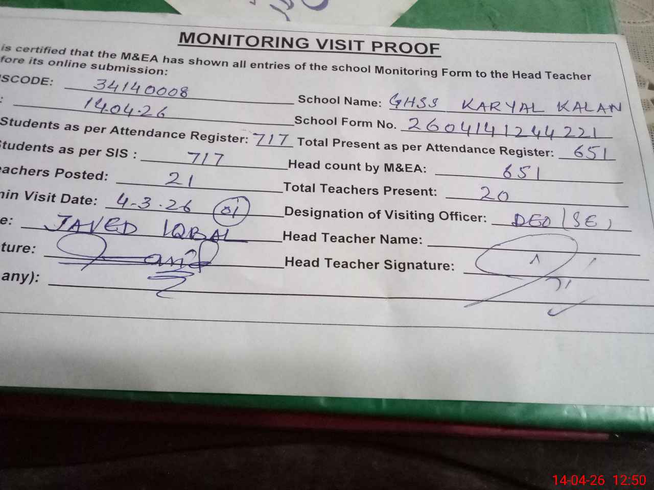 | Attendance Register | Head Teacher | MEA with School | Visit Proof |
