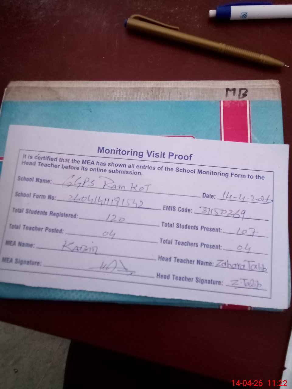 | Attendance Register | Head Teacher | MEA with School | Visit Proof |