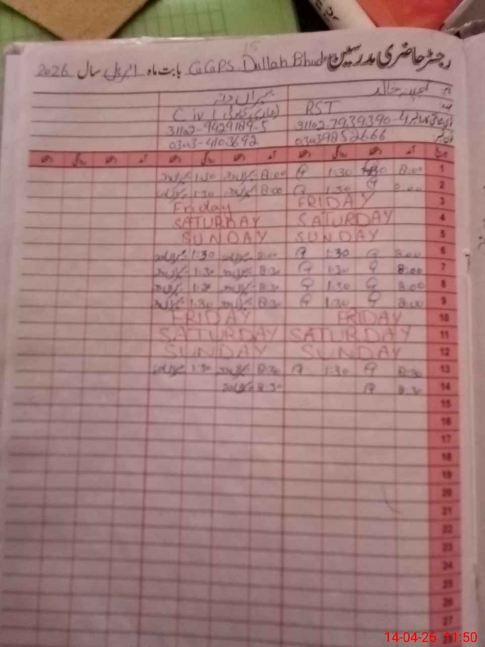 | CNIC | Full Name | Designation | R/C | Absence During Last Calender Month |
