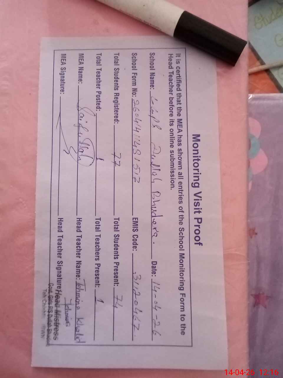 | Attendance Register | Head Teacher | MEA with School | Visit Proof |