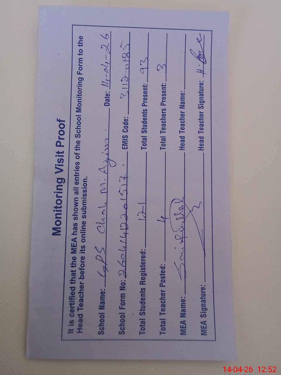 | Attendance Register | Head Teacher | MEA with School | Visit Proof |
