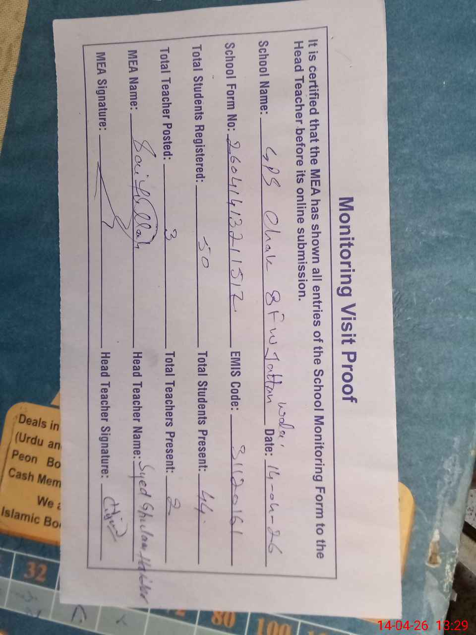 | Attendance Register | Head Teacher | MEA with School | Visit Proof |