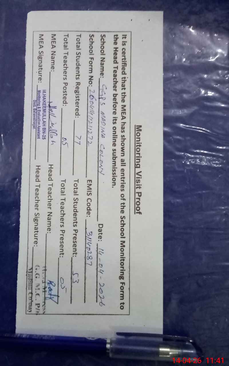 | EMIS Code: 31140287 | Name of School: GGPS MADINA COLONY | |||