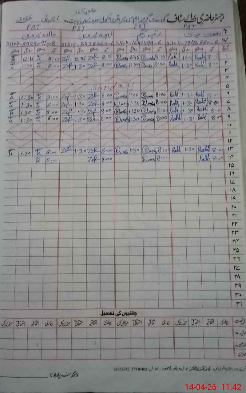 | CNIC | Full Name | Designation | R/C | Absence During Last Calender Month |