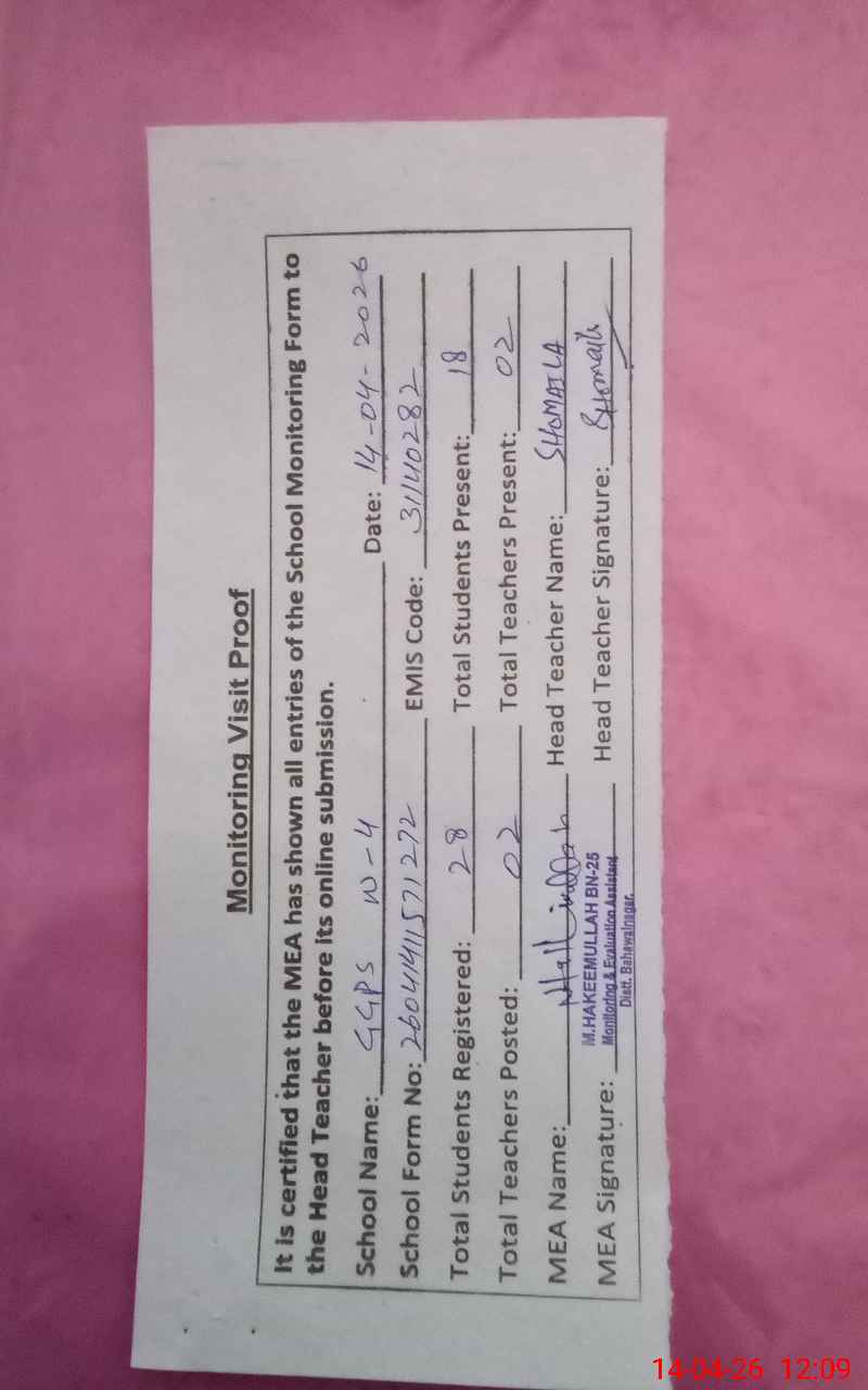 | EMIS Code: 31140282 | Name of School: GGPS WARD NO. 4 HAROON ABAD | |||