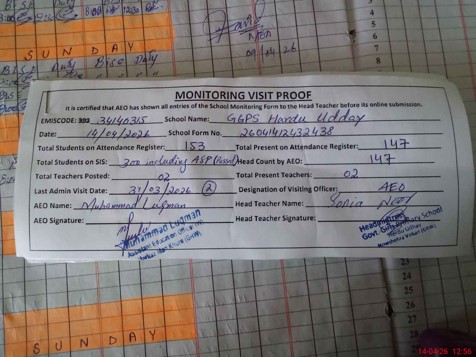 | Attendance Register | Head Teacher | MEA with School | Visit Proof |
