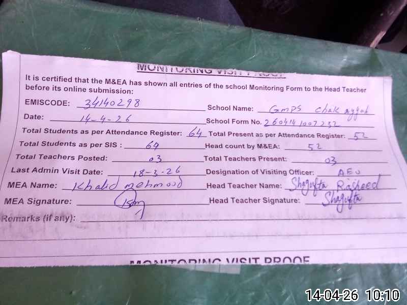 | EMIS Code: 34140298 | Name of School: GMPS CHAK AYYAH | |||