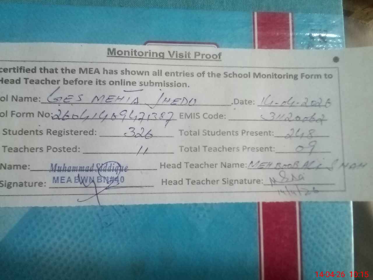 | Certified that this School was Inspected by the Undersigned MEA/DMO Today and the Information Stated Above is as Per Record. | |||||
