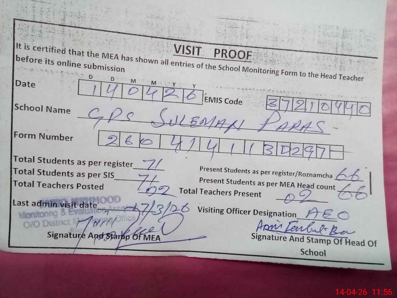 | Attendance Register | Head Teacher | MEA with School | Visit Proof |