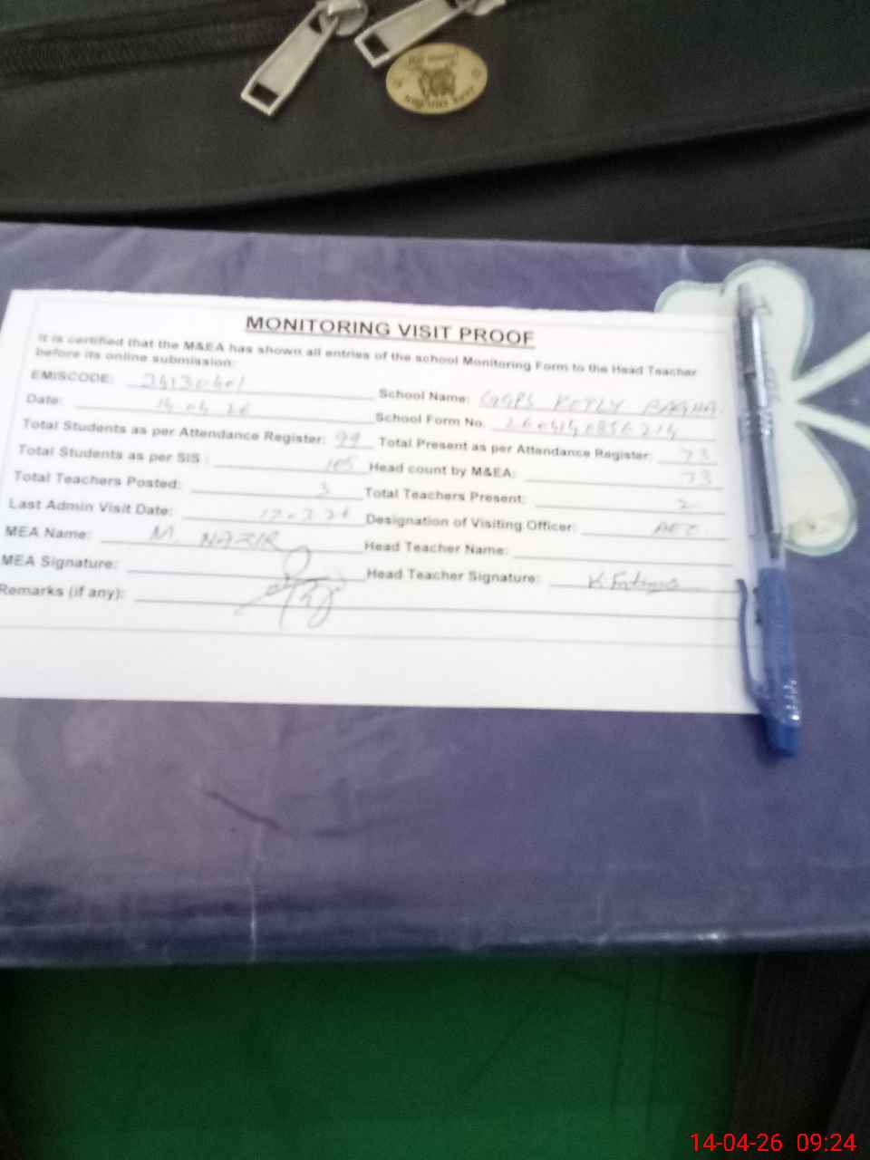 | Attendance Register | Head Teacher | MEA with School | Visit Proof |