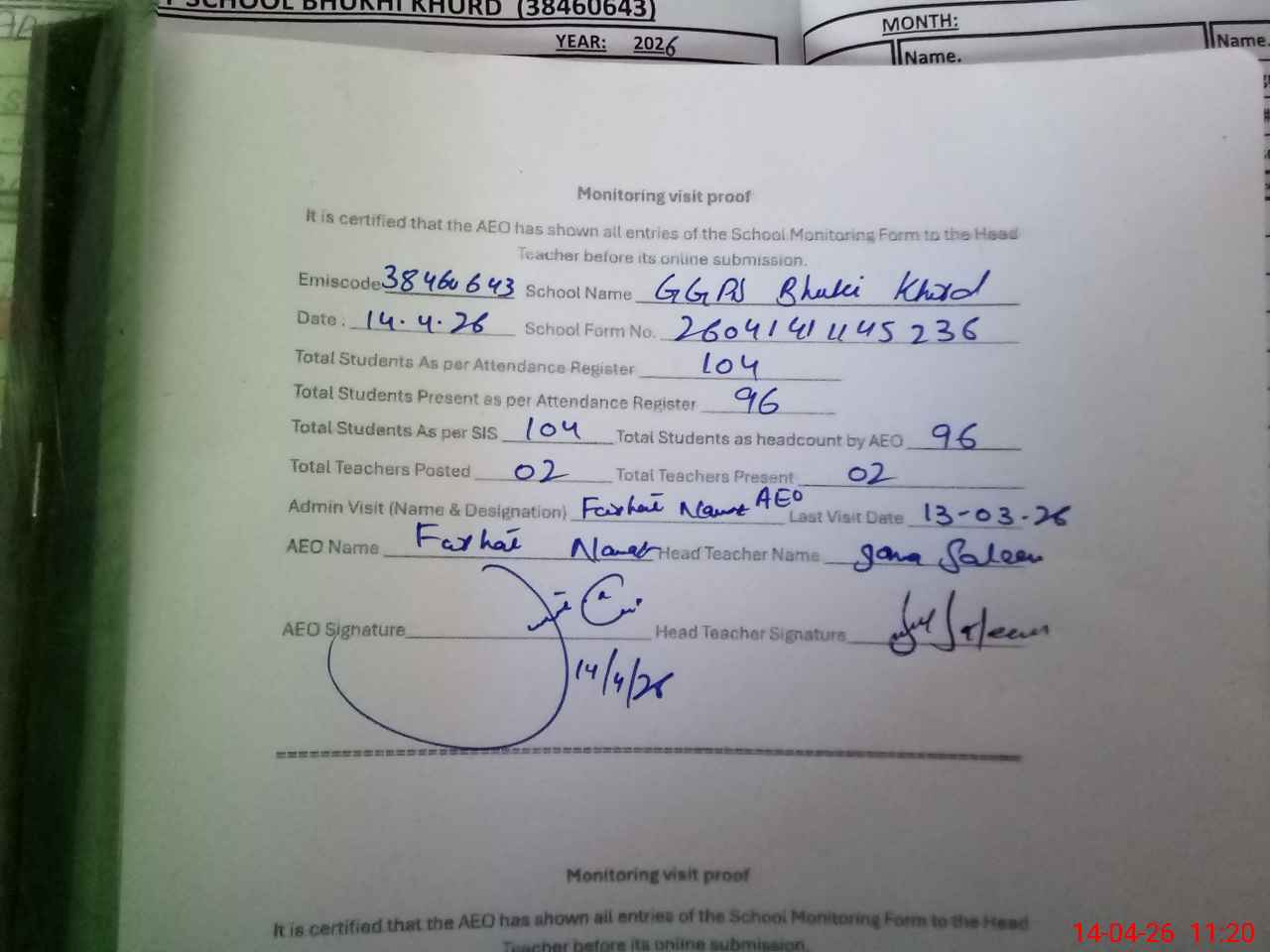 | Attendance Register | Head Teacher | MEA with School | Visit Proof |