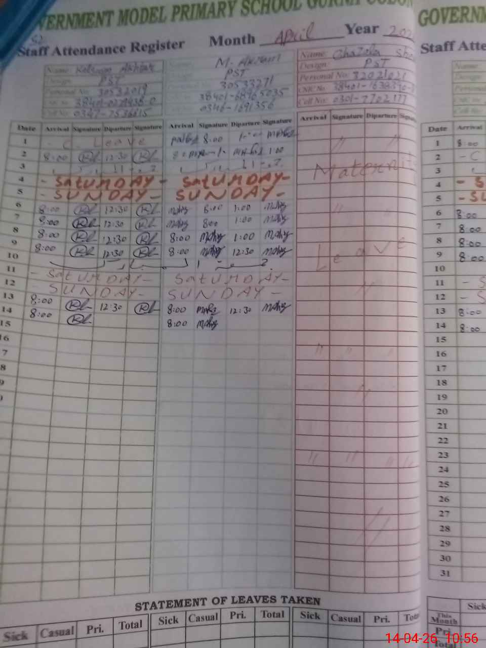 | 38**** | Gh**** Sh**** | PST Science/Maths | Regular | 31 | 0 | 0 | 31 | 0 | 0 | 0 | 0 | 0 | Maternity |