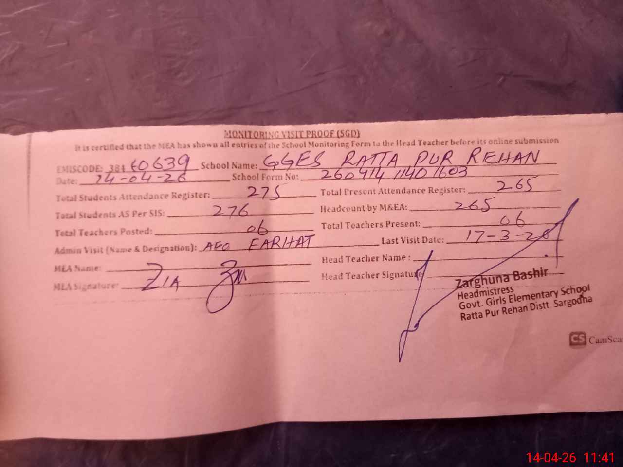 | Attendance Register | Head Teacher | MEA with School | Visit Proof |
