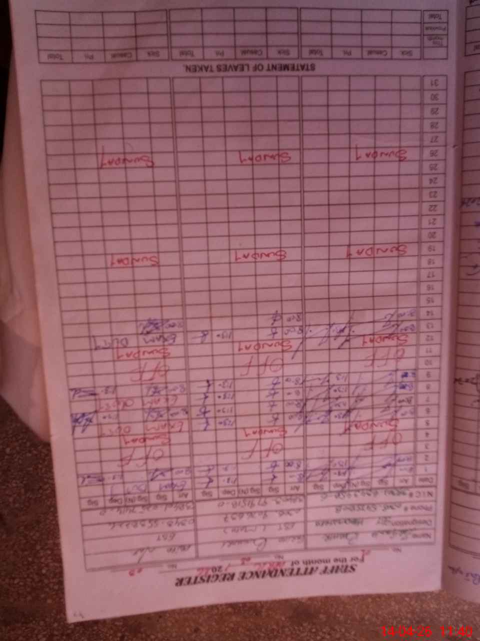 | CNIC | Full Name | Designation | R/C | Absence During Last Calender Month |
