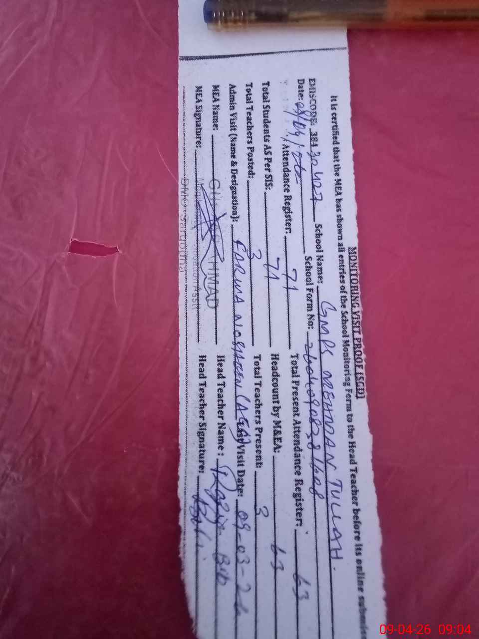 | Attendance Register | Head Teacher | MEA with School | Visit Proof |