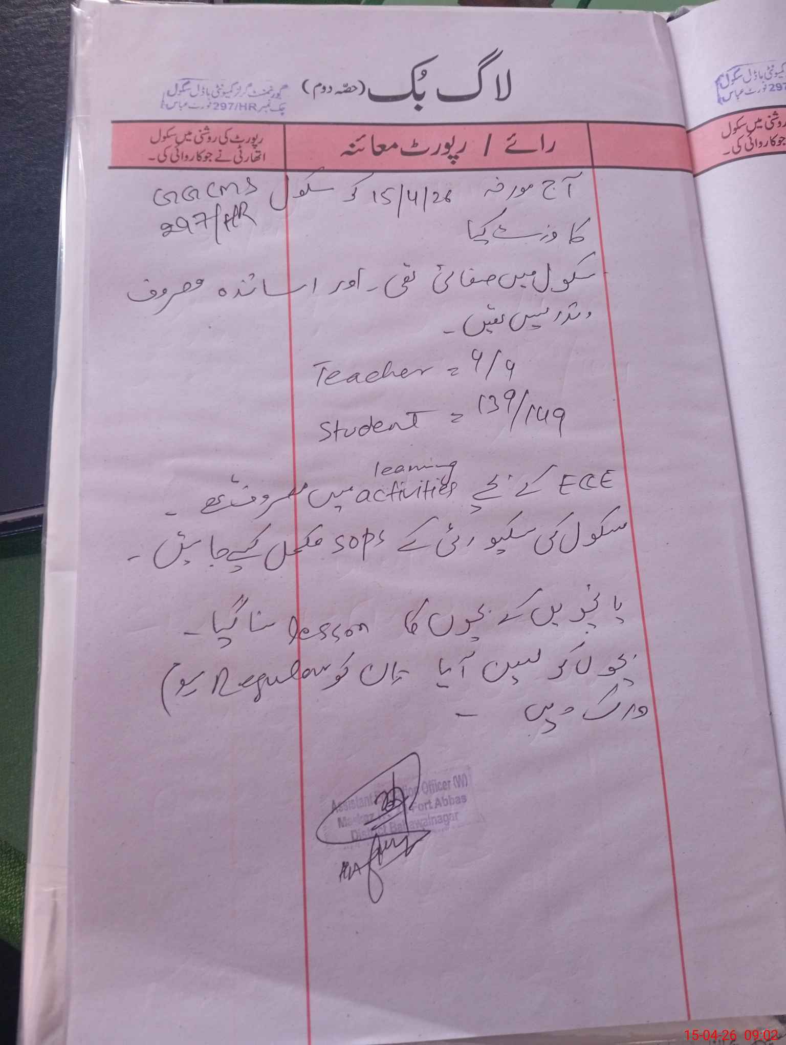 | EMIS Code: 31130356 | Name of School: GGCMS CHAK NO. 297/HR | |||