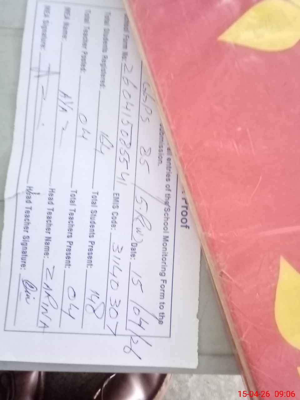 | Attendance Register | Head Teacher | MEA with School | Visit Proof |