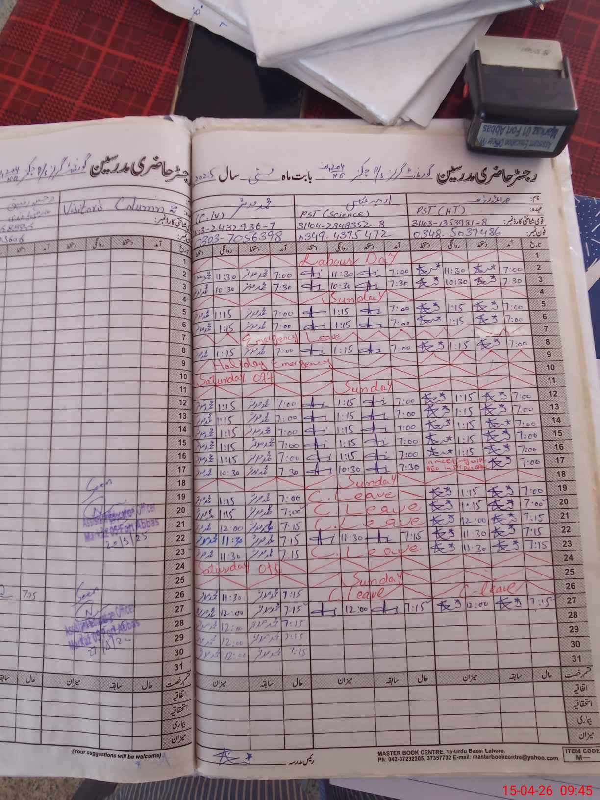 | CNIC | Full Name | Designation | R/C | Absence During Last Calender Month |
