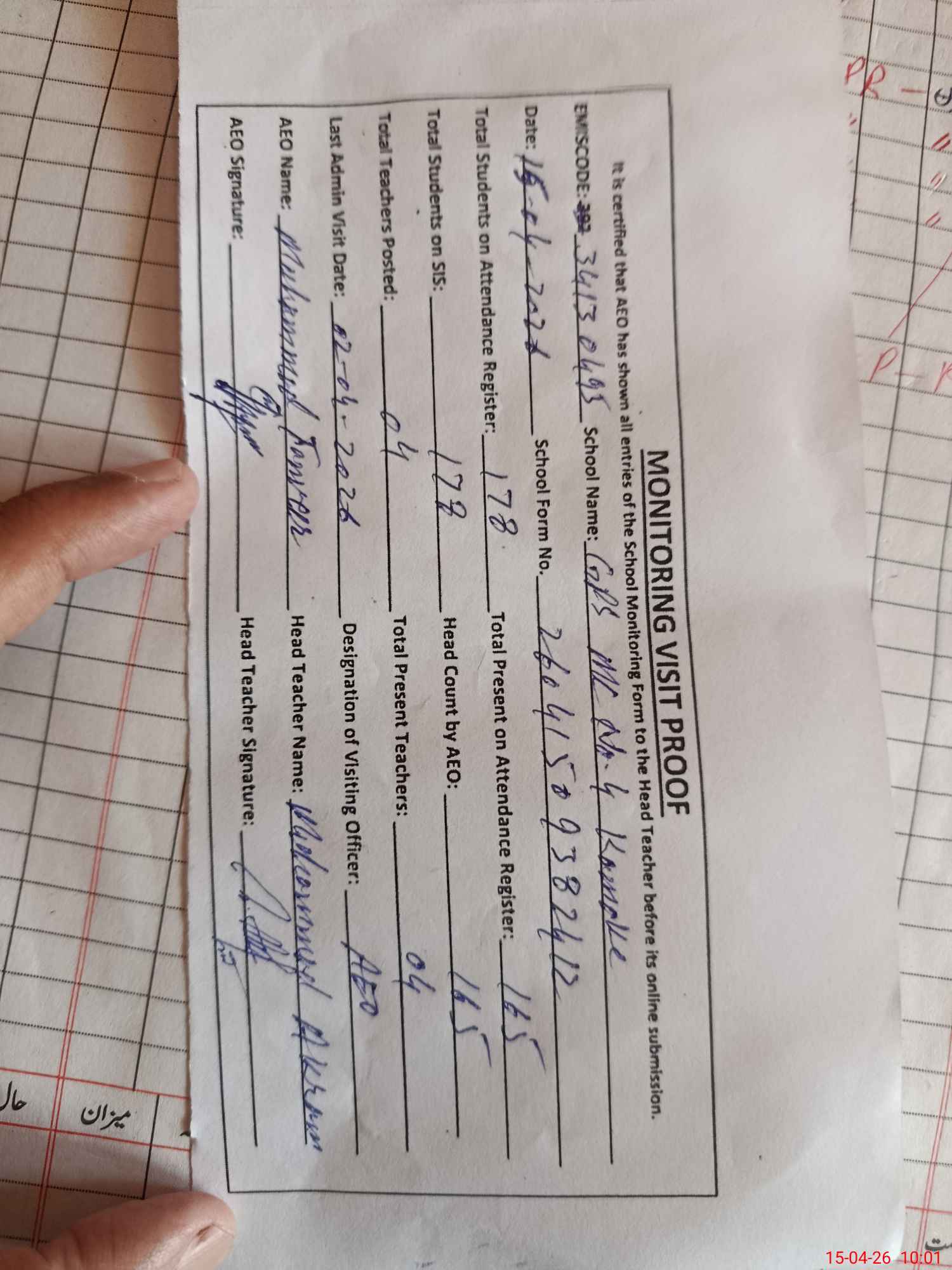 | Attendance Register | Head Teacher | MEA with School | Visit Proof |