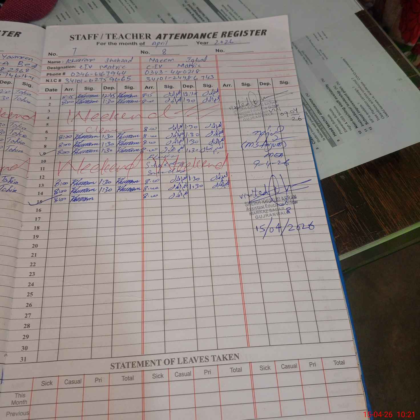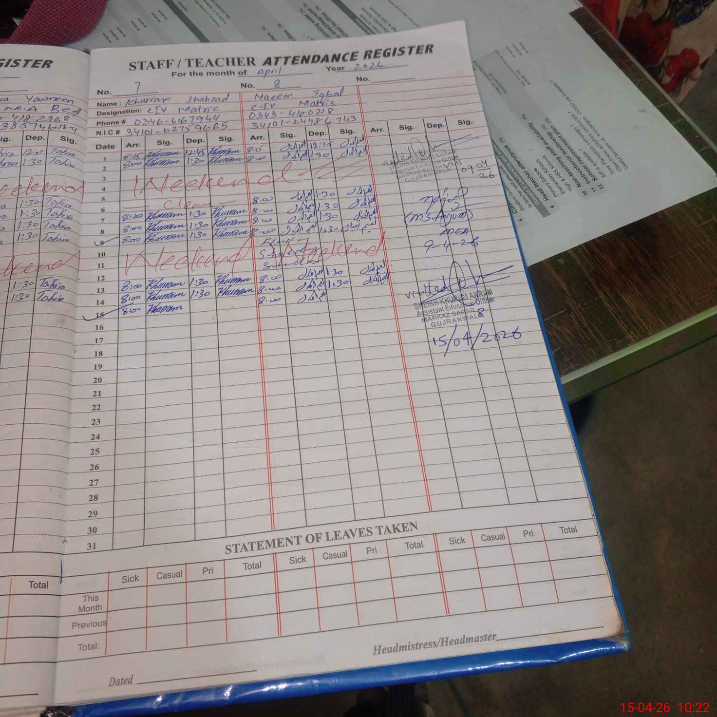 | CNIC | Full Name | Designation | R/C | Absence During Last Calender Month |