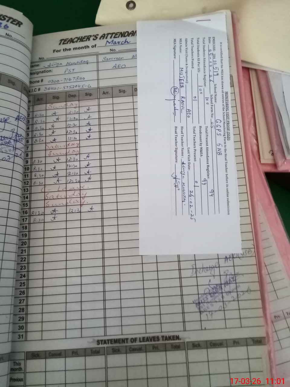 | Name: At**** Mu**** Designation: (School Headmaster's/Headmistress's) PST Phone/Cell Number: 03**** |