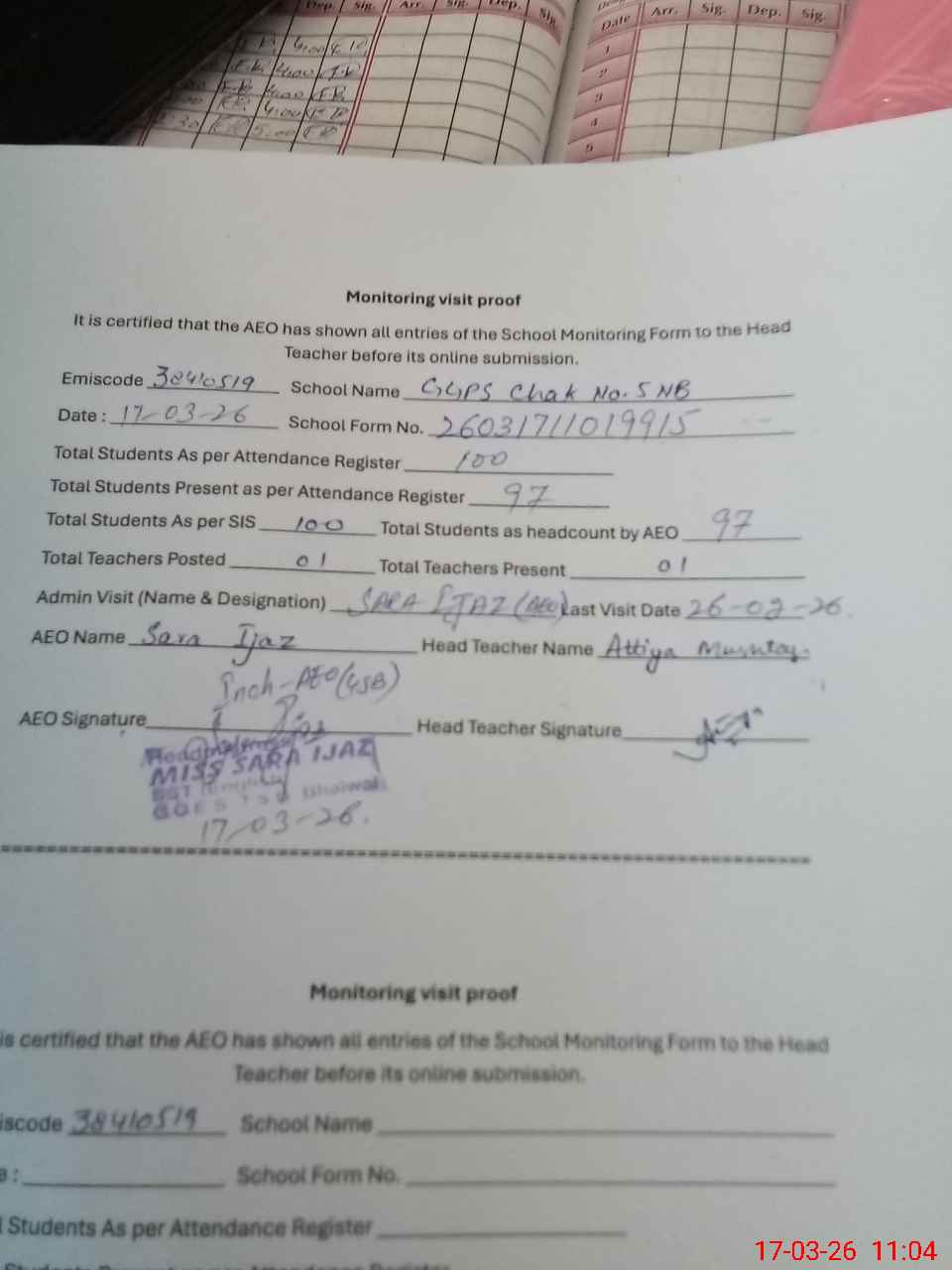 | Attendance Register | Head Teacher | MEA with School | Visit Proof |