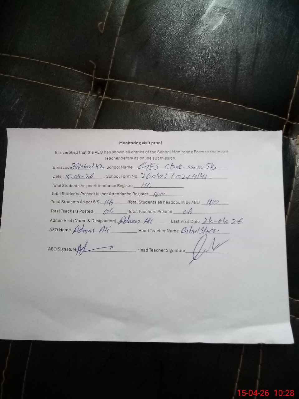 | Attendance Register | Head Teacher | MEA with School | Visit Proof |