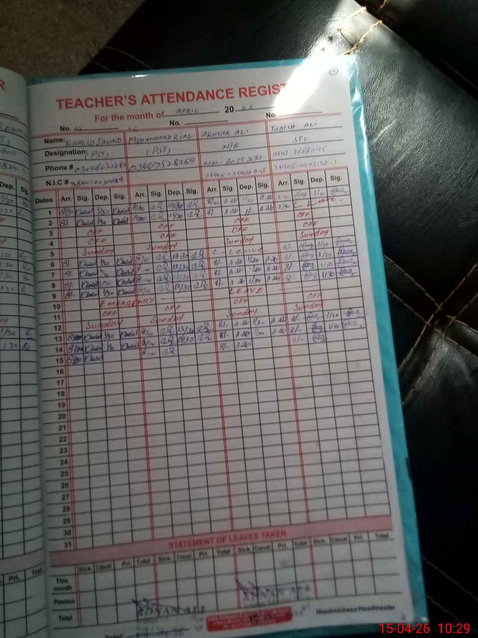 | CNIC | Full Name | Designation | R/C | Absence During Last Calender Month |