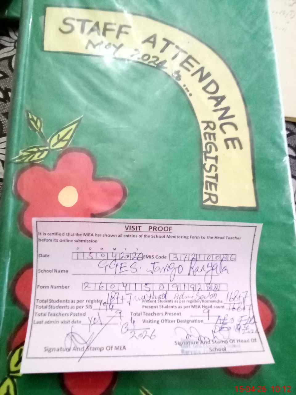 | Attendance Register | Head Teacher | MEA with School | Visit Proof |
