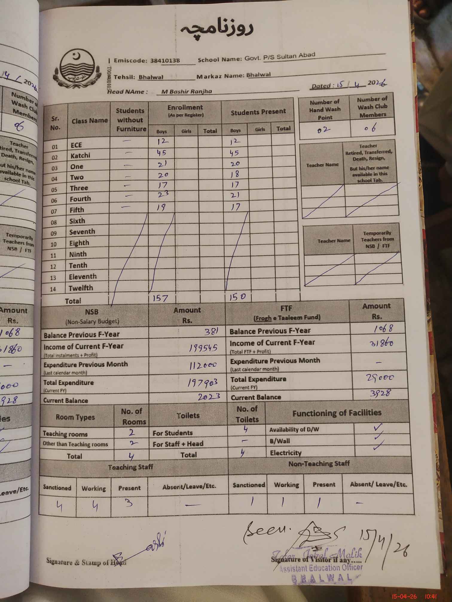 | District: SARGODHA | Tehsil: BHALWAL | Markaz: BHALWAL - MALE | Level: Primary | |