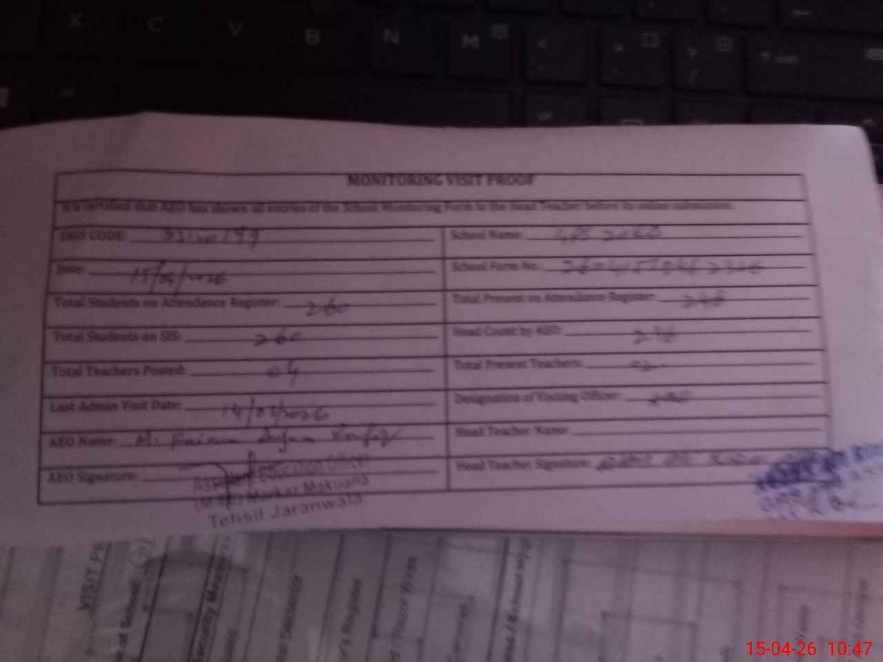 | Attendance Register | Head Teacher | MEA with School | Visit Proof |