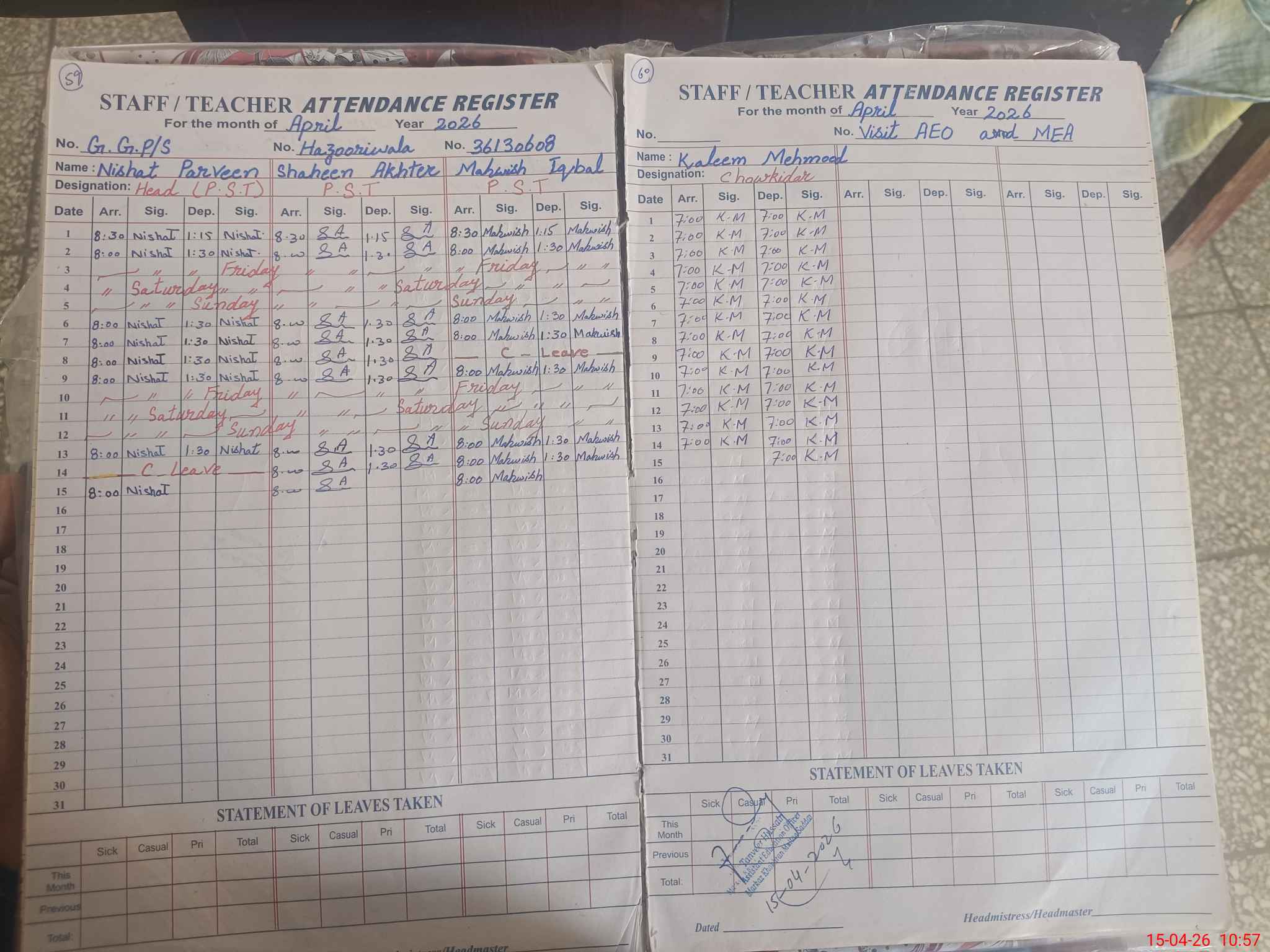 | Attendance Register | Head Teacher | MEA with School | Visit Proof |