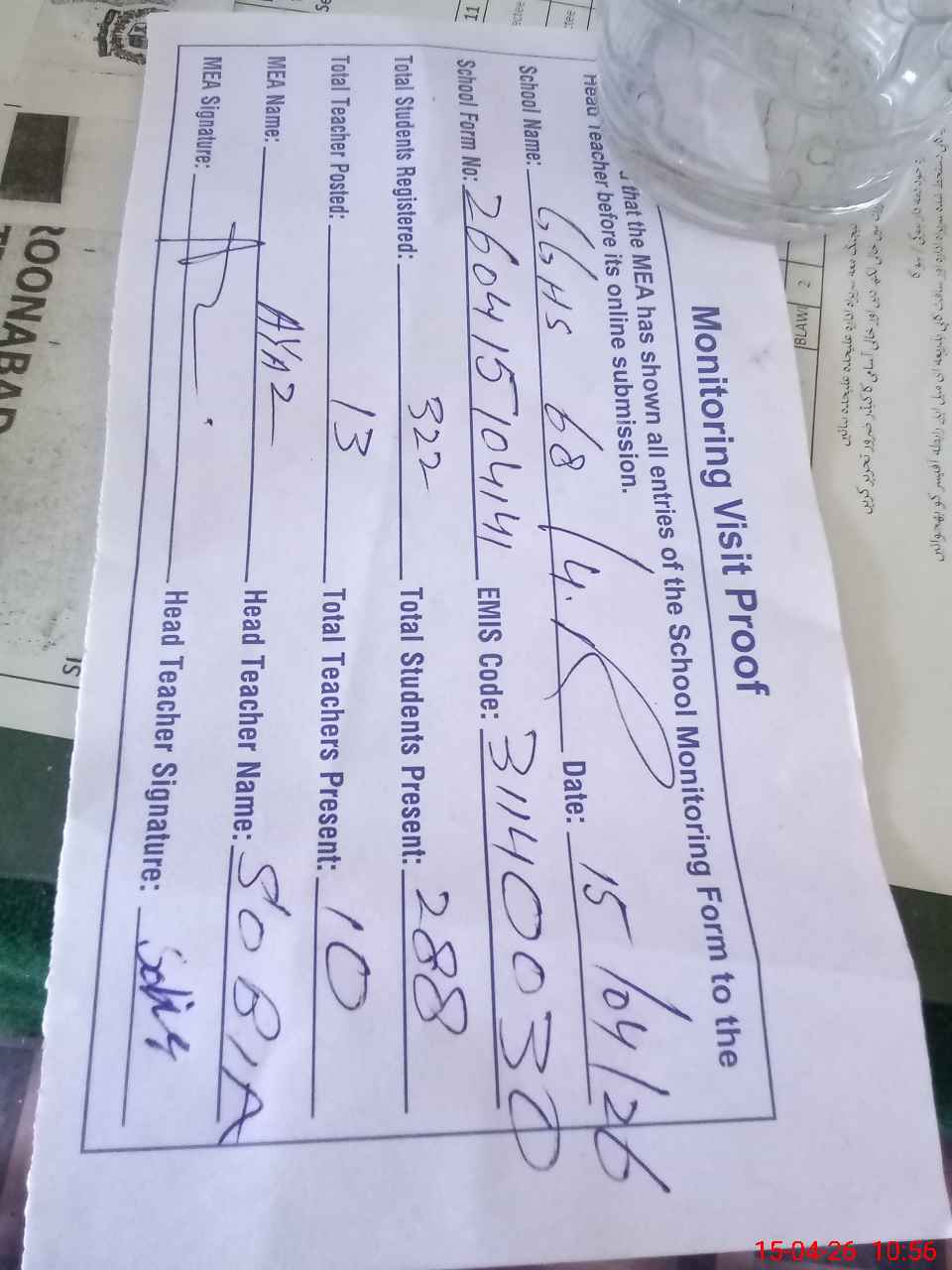 | Attendance Register | Head Teacher | MEA with School | Visit Proof |
