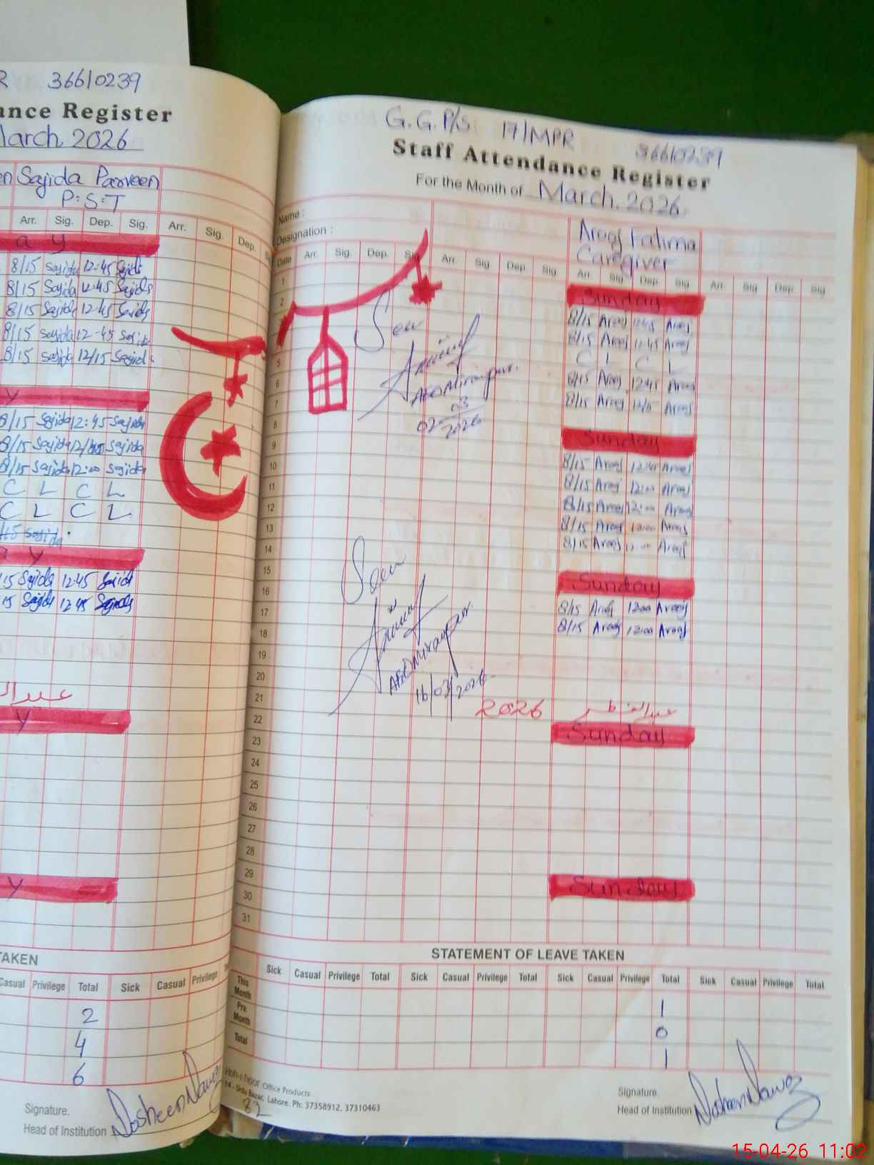 | Leave | Duty | Absent | Maternity | Medical | Ex- Pak |