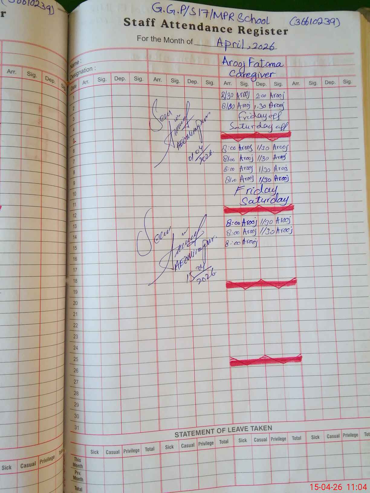 | Attendance Register | Head Teacher | MEA with School | Visit Proof |