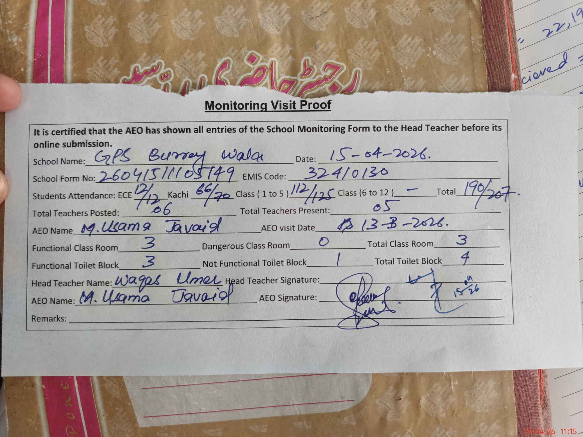 | EMIS Code: 32410130 | Name of School: GPS BURREY WALA | |||