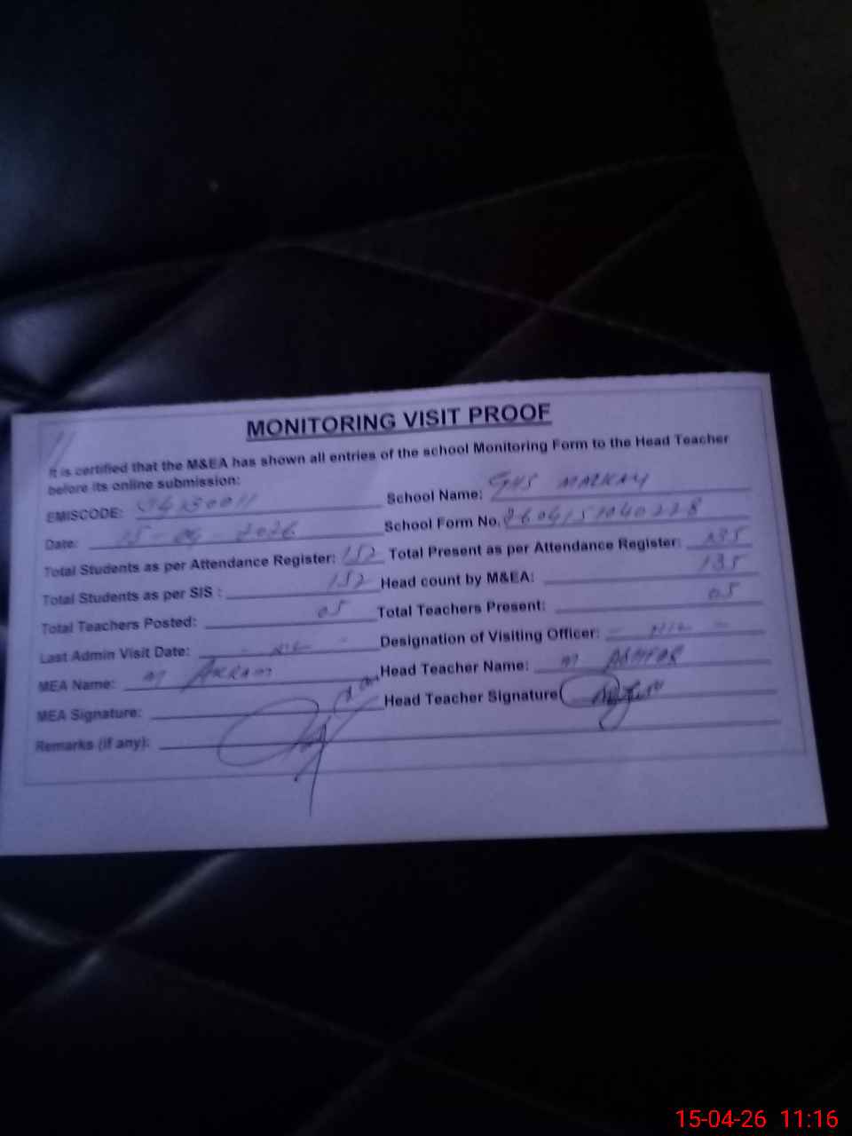 | Attendance Register | Head Teacher | MEA with School | Visit Proof |