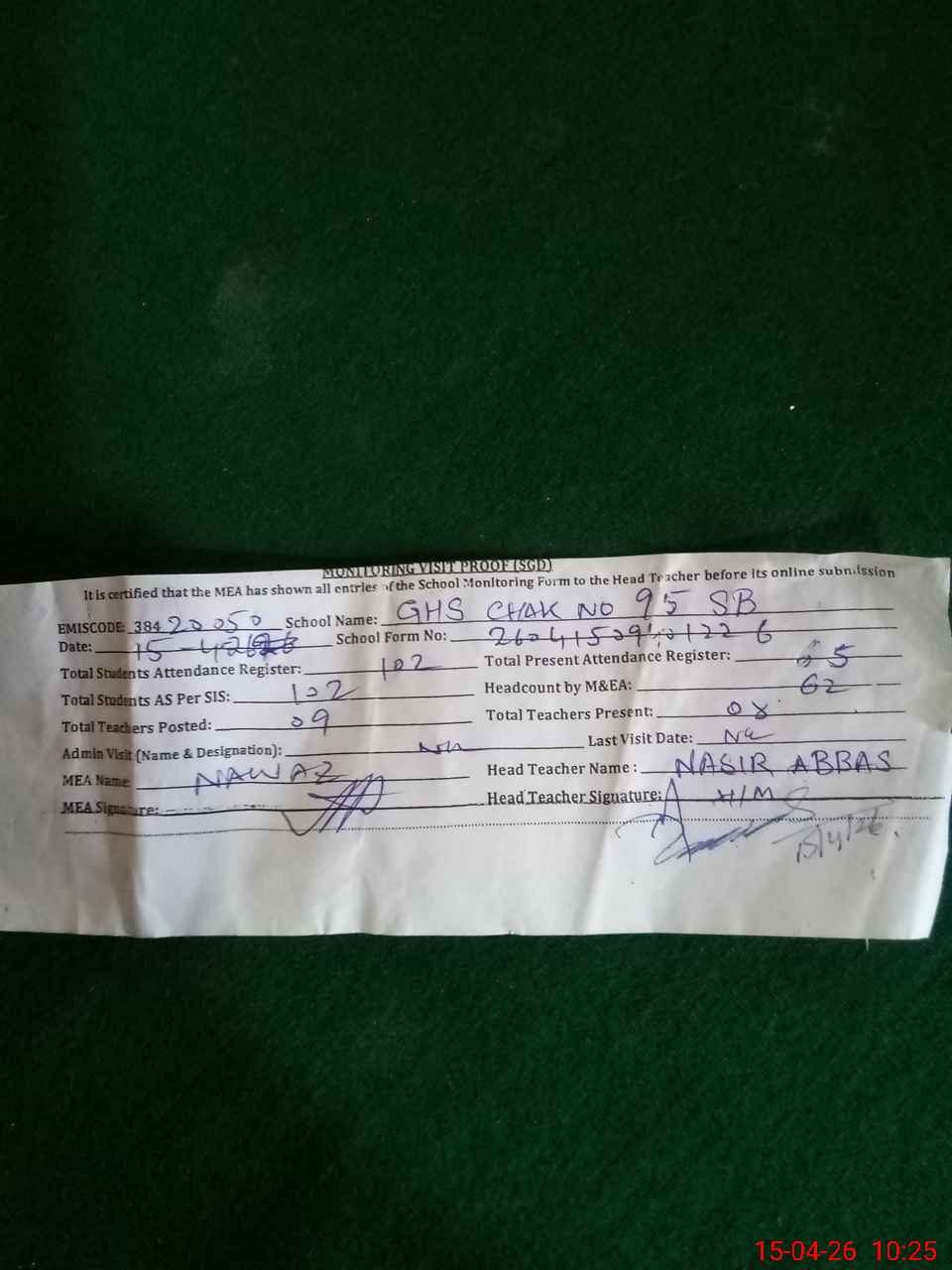| EMIS Code: 38420050 | Name of School: GHS CHAK NO.95 SB | |||