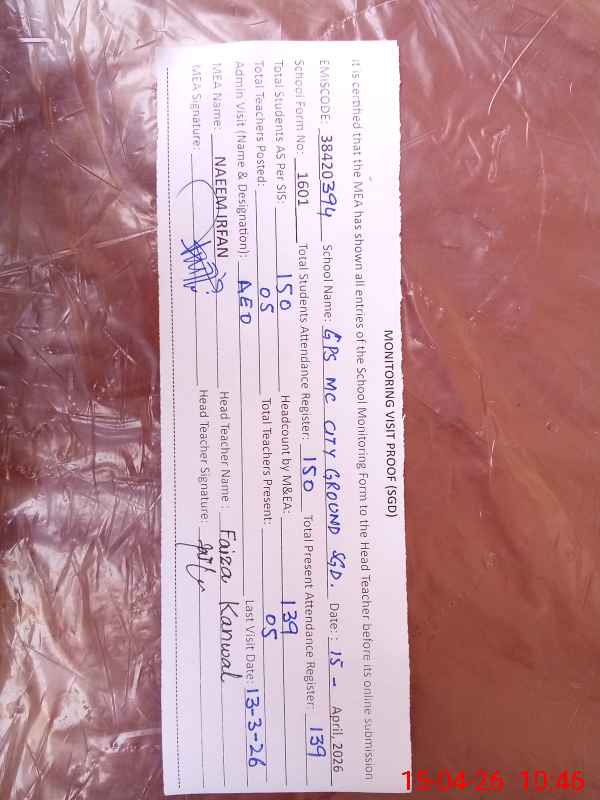 | EMIS Code: 38420394 | Name of School: GPS MC CITY GROUND SARGODHA | |||
