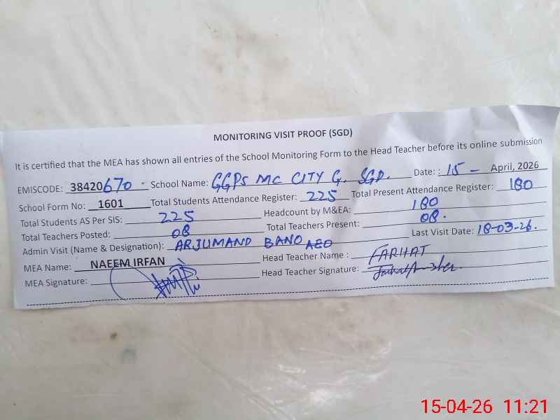 | EMIS Code: 38420670 | Name of School: GGPS MC CITY GROUND SARGODHA | |||