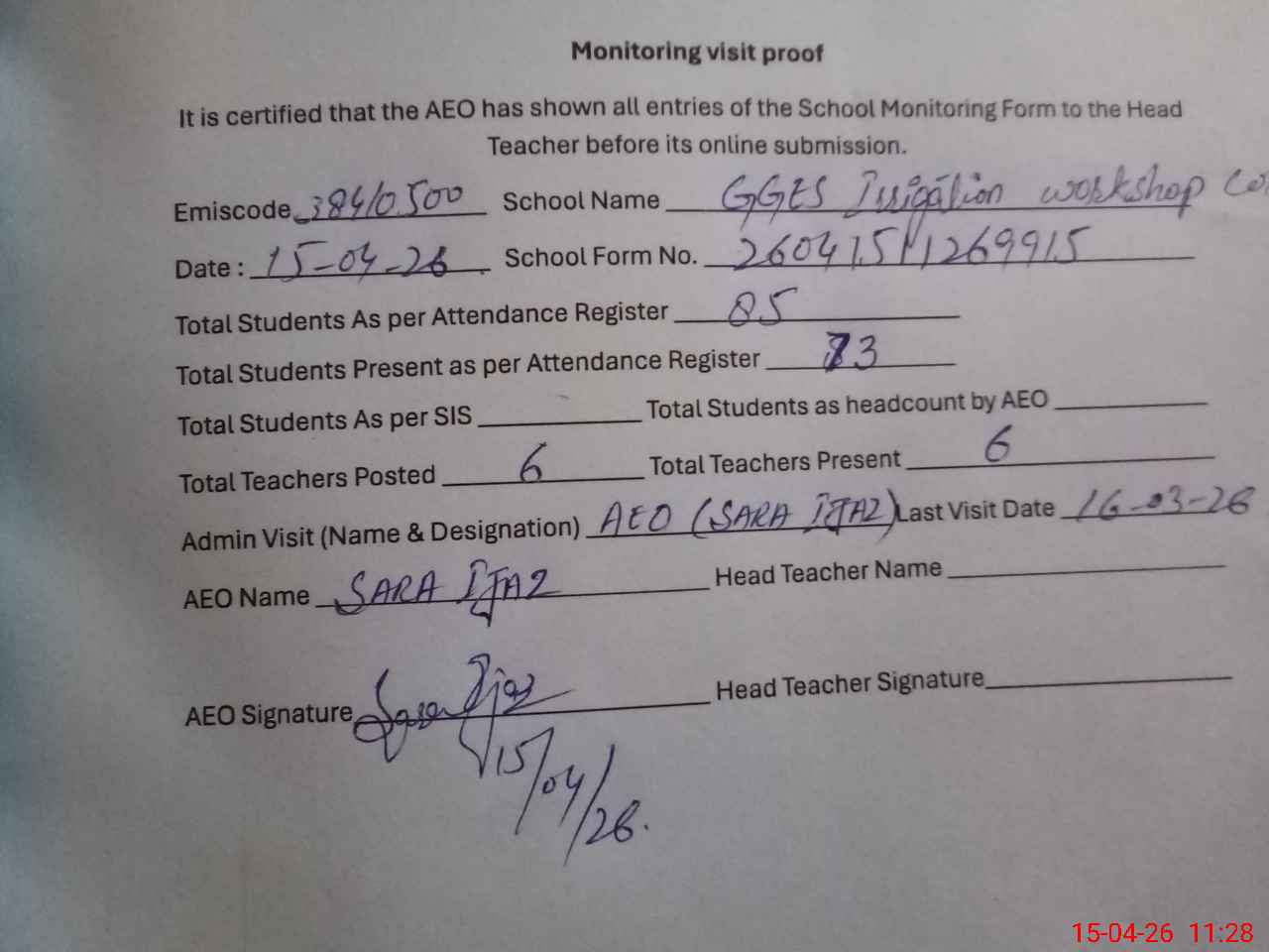 | Attendance Register | Head Teacher | MEA with School | Visit Proof |